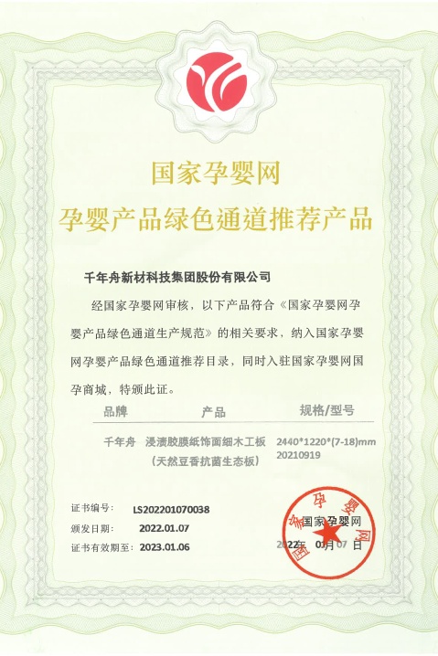 今年初,在國家孕嬰網層層篩選和嚴格審核下,千年舟天然豆香抗菌生態板,正式成為“國家孕嬰網孕嬰產品綠色通道”推薦產品,意味著安全綠色、孕嬰可用。