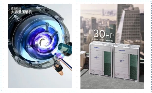 面對龐大的中央空調使用需求,三星中央空調為項目配備總規模2390HP的產品,以堅實技術實力,助力園區發展。三星中央空調高壓腔氣液增焓渦旋式變頻直流壓縮機采用線性變壁厚渦旋盤設計,增加吸氣空間,吸入更多冷媒同時增強排氣部位的強度保持系統穩定,提升排氣量,有了它的加持,整個空調系統具備穩定可靠、高效節能等多項特點,可應用于機場、軌道交通、酒店、商業等多種建筑領域。強勁的制熱功能,一直都是三星中央空調的性能亮點,經過技術不斷的升級,推出高效的氣液增焓技術。