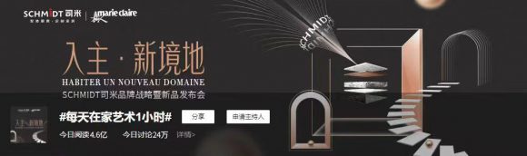 因#每天在家藝術1小時#引起大眾對精神世界的“高價值共鳴”,微博話題閱讀量高達4.6億,參與度突破24萬,燃啟一股全民藝術參與潮。再一次深刻表達SCHMIDT司米乘于藝術之上,用藝術為大眾成就美好生活的意圖,塑造大眾對SCHMIDT司米“環球藝術家居 司米1934”的全新品牌形象,更為SCHMIDT司米藝術生活體驗空間廣集傳播聲量。