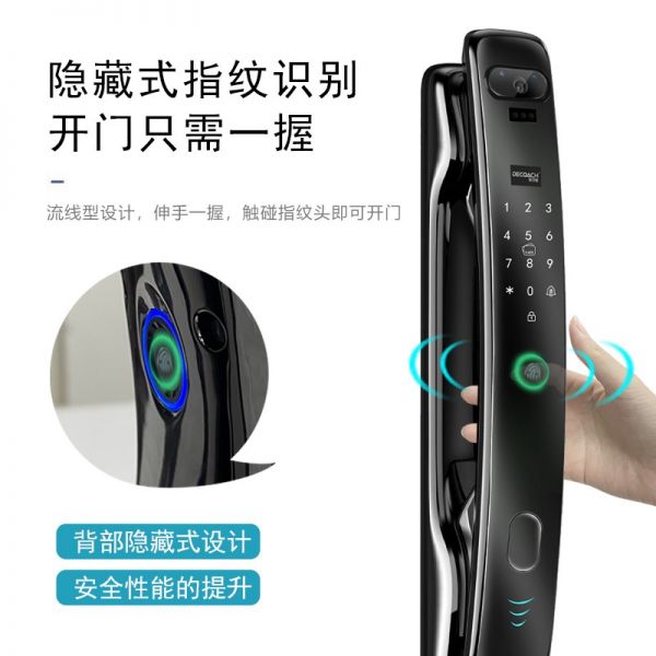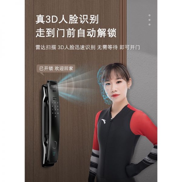 德鎧曼智能鎖的3D人臉識別技術可適應無光、變化表情、妝容造型等多種實際使用環境,無論男女老少都方便,讓整個開門過程更便捷,也更安全。在解鎖過程中,不需要用戶特地按壓門把手,識別臉部即可自動解鎖。在雙手都被占用時,完成人臉識別后,身體輕靠上去即可將門打開,真正做到解放雙手。