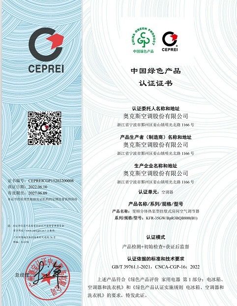 奧克斯空調成為首批“中國綠色產品認證”家電企業之一,不僅證明了其在高質量、可持續發展上取得的碩果,也將帶動消費升級,倡導更多消費者選擇綠色產品、身以實際行動打造節能環保生活。未來,奧克斯空調將繼續秉持綠色低碳發展理念,積極發揮“中國綠色產品認證”的示范效應,同時持續創新產品技術、升級工藝管理,打造更多綠色產品,助推空調行業高質量發展,為我國生態文明建設和“雙碳”目標實現貢獻一份力量。
