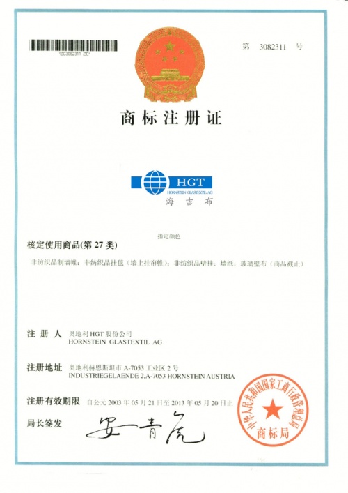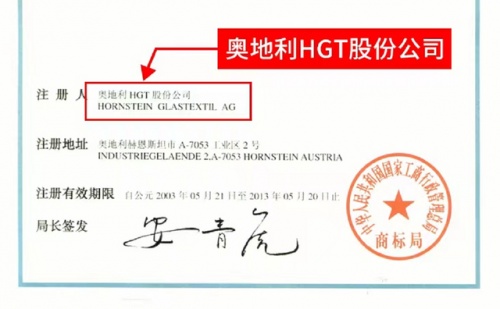 這里有一張中國商標局頒發(fā)的、海吉布的商標注冊證。從商標注冊證上,我們可以清晰地看到:HGT海吉布是一個注冊商標,最早由奧地利HGT股份公司注冊,在中國的注冊時間始于2003年。