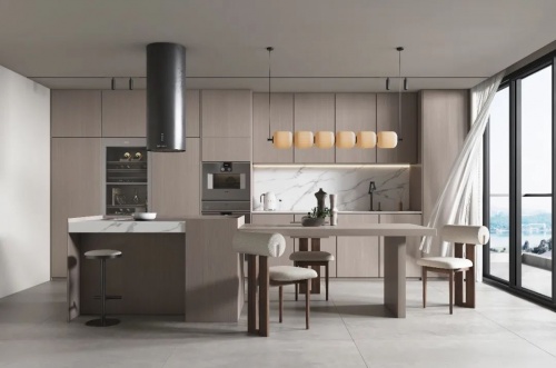 有些低調,但低調中洋溢著精致,細節一絲不茍。千年舟纖素意木花色,靈感來源于工業鋼板與藤編、纖維等因素,橫豎錯開的金屬紋理與木制結合既有素色纖維交織的感覺,同時紋理深淺的變化與原本顏色的貼合也會突出原來木制顏色的美感與質感,從細節提升家居調性。