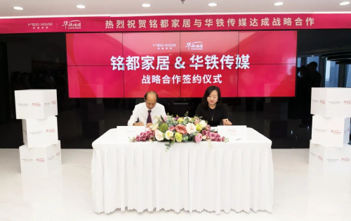 銘都家居有限公司副總經理鄭祖榮、華鐵傳媒集團有限公司北京第十二事業部銷售副總經理李雅文等領導嘉賓出席簽約儀式,共同就雙方行業發展、品牌建設與合作事宜進行真誠且深入的交流。會上,雙方領導簽署戰略合作協議,全面開啟銘都家居品牌宣傳戰略,帶來品牌聲量和銷量的雙重爆發!
