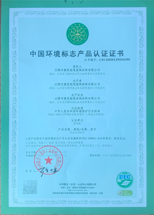 目前,澳思柏恩生產(chǎn)的成品板材全面通過美國CARB,日本F☆☆☆☆,EPA美國環(huán)境保護(hù)局,歐盟CE認(rèn)證,質(zhì)量、環(huán)境、職業(yè)健康安全管理三體系認(rèn)證,中國環(huán)境標(biāo)志產(chǎn)品認(rèn)證,兒童安全級產(chǎn)品認(rèn)證等多項(xiàng)嚴(yán)苛認(rèn)證,堅(jiān)持綠色環(huán)保可持續(xù)發(fā)展的理念,對全球資源環(huán)境負(fù)責(zé)。
