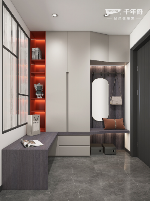 推門而入,入戶空間折疊鋪展,素雅灰與簡潔白交錯搭配,提升空間層次感。設計師以藤編為線,素雅為尺,設計出理想空間,一門到頂的柜門,貼面式墻鏡,分割平行的矮凳,帶來舒適的入戶體驗,歸家也要滿滿的儀式感。