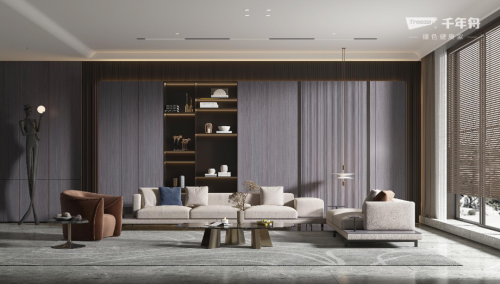走進客廳,素靜輕雅的雁行意木縱深排列,結合簡潔的金屬線條,勾勒出柜體的輪廓,再配合直線紋理光影變換,讓空間多了一種藝術語言,整個格局更加整齊劃一。