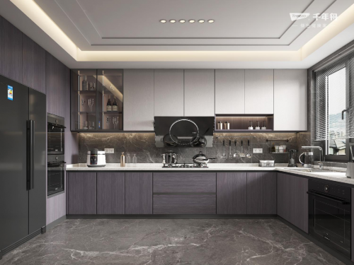 柔和內斂的灰與簡潔干凈的白精巧的分割空間,層次分明,相得益彰。藤編紋理低調簡約游走于廚房各處。U型空間布局,合理規劃功能設計,在玻璃柜中光影襯托之下,把整個環境變得更加典雅從容。