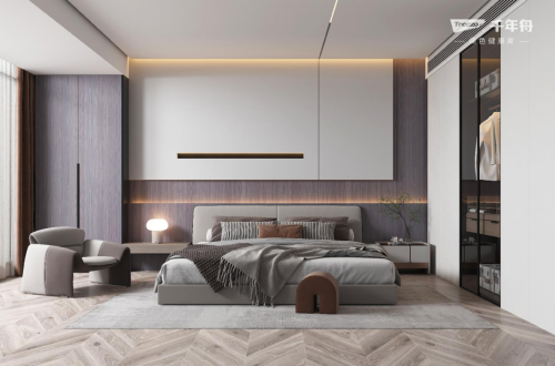 主臥以雁行意木與極光白作為主色板,簡約素凈的潔白墻板帶來一絲溫婉氣息。配合溫潤恬靜的雁行意木,自然與真實,精致與溫婉,為臥室增添理性與優雅的生活氣。整個室內空間融入大自然光影,雜糅星星點點的燈光,營造出自然柔和的氛圍。