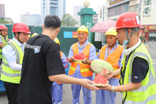 酷暑天氣,中鐵二局六公司成都軌道交通13號線小南街站正施工正酣。“每天能夠吃上項目‘清涼小車’送過來的西瓜,喝上藿香正氣液、綠豆湯、王老吉,真幸福!”結(jié)構隊伍鋼筋工老許在施工作業(yè)的間隔休息時吃著西瓜,開心地咧開嘴笑了。如今,隨著“送清涼服務隊”頻繁深入工地一線,“清涼小車”已經(jīng)成為項目部各個工點作業(yè)人員翹首以盼的“心頭好”。