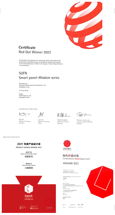 三峰照明添智系列憑仗本身的創新設計和工藝,榮獲10款外觀專利、當代好設計獎、紅棉中國設計獎和紅點產品設計獎等多重大獎。資深評審團從創新表現、產品的外觀、材質、功能、以及使用感受等九大維度對產品進行全方位的精細考究及謹慎評估選定,這是設計行業對三峰照明的品牌實力、產品創新力等綜合實力的認可,更是三峰照明一直以來堅持原創設計,以及倡導健康光文化的榮譽見證。
