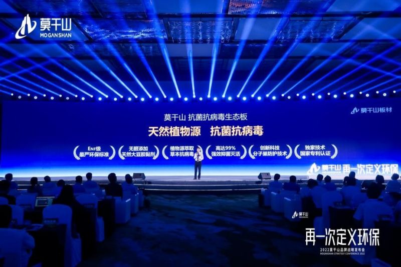 發布會上,莫干山板材還帶來了最新的環保板材產品——中國家居市場上首款ENF級抗菌抗病毒生態板。該產品由云峰莫干山聯合中國林業科學院共同研發,是雙方產學研技術合作的重大研究成果,其環保標準貫徹云峰莫干山一貫的高標準,整體甲醛釋放量為0.012mg/m3,大大優于ENF級國家環保標準(≤0.025mg/m3)。經中國林業科學院、浙江省林科院等國內六大權威機構鑒定,該產品達到國際領先水平。