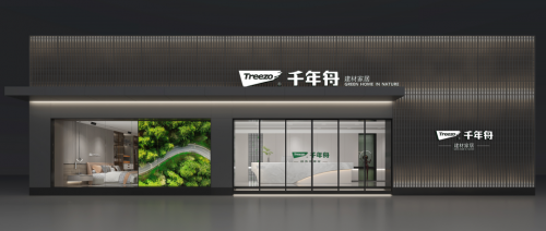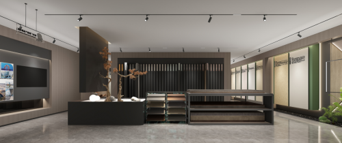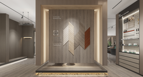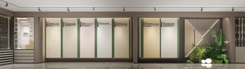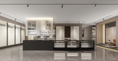 形象亮點——形象墻采用千年舟高雅灰板材作底,在燈光的映襯下整體呈現典雅溫和的質感,呼應品牌LOGO的簡約大氣。