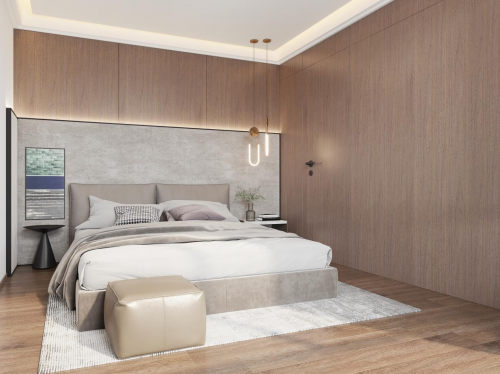 次臥——大面積的咖色墻板應用,帶有天然木紋的通直視覺,有效拉升了整體空間格局與層高,讓次臥在視覺上得以空間擴充,簡單的極簡吊燈與幾何元素床頭柜與腳蹬,帶來極簡空間的獨特精致感。