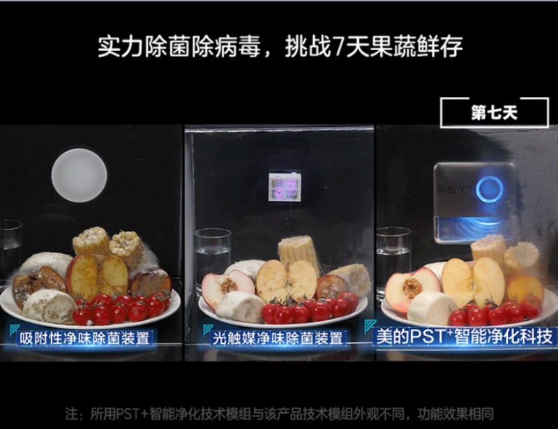 美的冰箱設置的7天果蔬鮮存挑戰實驗,就是一個敢秀又硬核的對比測試:將三組完全一致的食材,分別放置于不同原理的凈化模塊中,經過七天的時間,只有PST+智能凈化科技模塊所在的實驗組,食物基本保持新鮮,而對照組的食物基本上都已經發霉腐敗不堪。這樣的實驗現象說明PST+智能凈化科技能有效延緩食物腐敗,實現長久保鮮,在一眾同類型冰箱中實力最出眾。