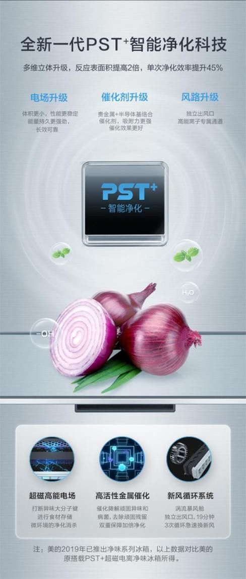 而市面上還有一些更“卷”的技術,基于電解式的原理進行了進一步的優化。例如美的冰箱凈味系列搭載的“PST+智能凈化技術”,通過電場升級,釋放百萬級超磁感電解離子,數量巨大的離子能高效地清潔密集囤貨的冰箱,在凈化技術上更為領先。