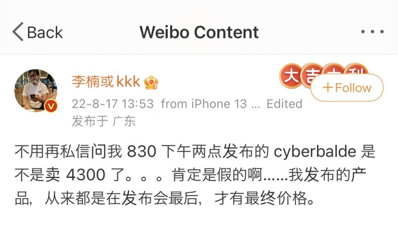 關于之前網絡上流出 CYBERBLADE 定價 4300 元的圖片,李楠則沒有正面回應,但表示自己直到發布會前一刻都不會敲定最終發售價格,結合同樣是昨天發布的微博來看,4300 元這個價格大概也只是李楠的又一顆煙霧彈。