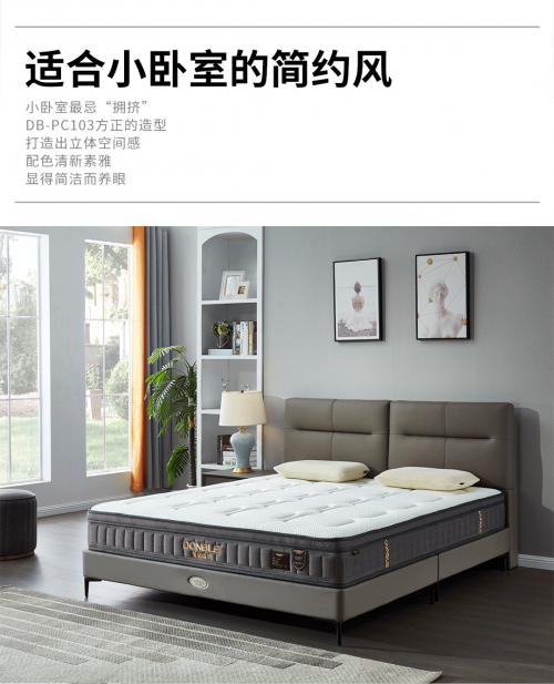 軟床相比于木床,最大的不同就在于它的舒適性。東寶軟床DB-PC103的外表采用超纖面料包裹,超纖面料觸感柔順,透氣親膚,耐磨耐用。床頭軟包采用高回彈超力棉填充,猶如一塊飽滿厚實的“法式面包”,給人以舒適倚靠。