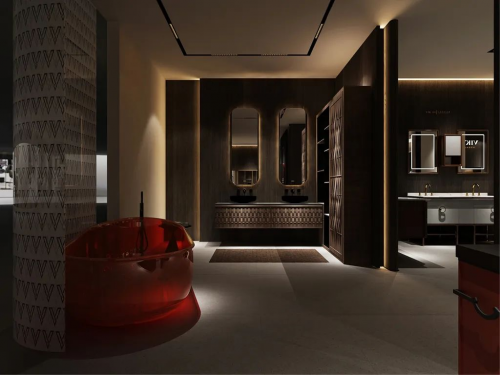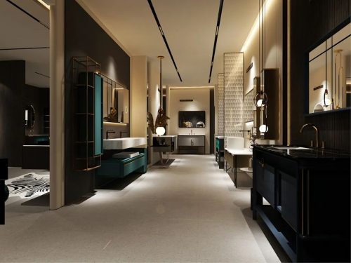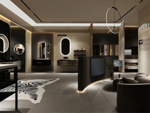 新展廳采用「黑灰」從展廳整體外觀到形象墻、洽談區(qū),再到浴室柜展示區(qū)、產(chǎn)品體驗(yàn)區(qū),采用不同的組合式設(shè)計(jì)和軟裝搭配,以新穎設(shè)計(jì)充分展現(xiàn)出浴室柜與家居相融合的極簡輕奢風(fēng)格的時尚感與高級感,將唯可衛(wèi)浴惟精惟一、以木為本的理念、主打產(chǎn)品和企業(yè)文化融入空間,于細(xì)節(jié)中展現(xiàn)輕奢魅力,演繹精致舒適生活。