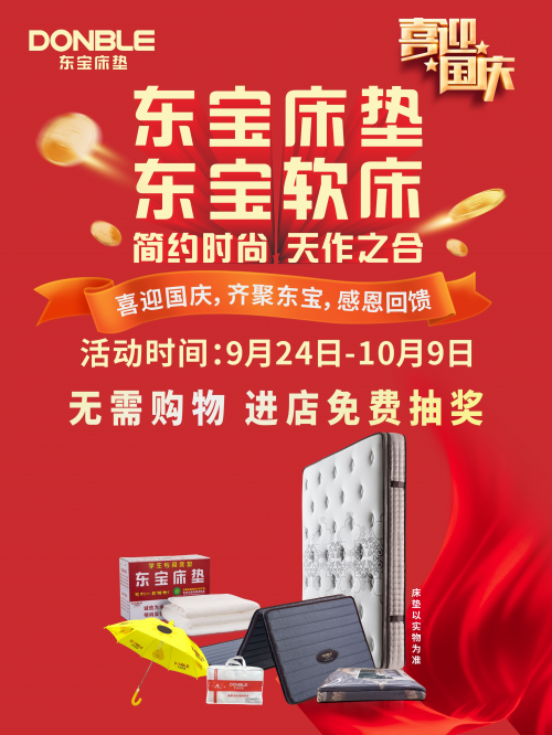 國慶節(jié)是舉國歡慶的日子,東寶床墊為大家真誠獻禮。國慶活動期間,無需購買產品,只要進店就可免費抽獎。