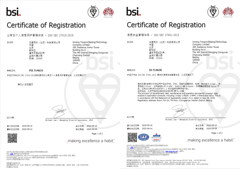 BSI中國區(qū)標(biāo)準(zhǔn)應(yīng)用方案副總裁張樂先生在頒證儀式上發(fā)表的賀詞中講到,通過ISO/IEC 27001信息安全管理體系和ISO/IEC 27018公有云個人信息保護(hù)管理體系的再認(rèn)證,意味著友盟+已經(jīng)具備并始終保持著完善的信息安全管理體系,以及國際化標(biāo)準(zhǔn)的信息安全管理能力,在個人信息處理的準(zhǔn)確性、透明化及安全性等方面已經(jīng)達(dá)到國際頂尖水平,有能力為客戶提供可靠的保護(hù)。