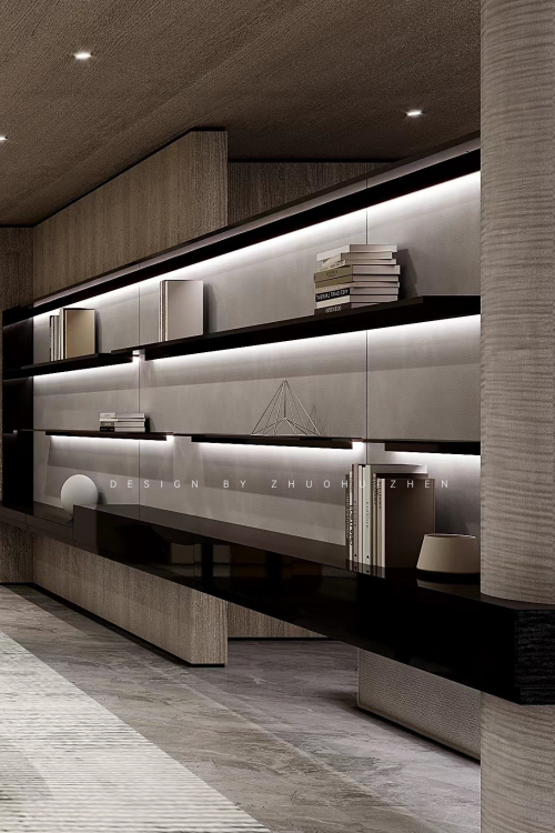 木石相依,材質運用與整體空間融為一體,收納、美學展陳、閱讀功能在此處依次巧妙融合。
