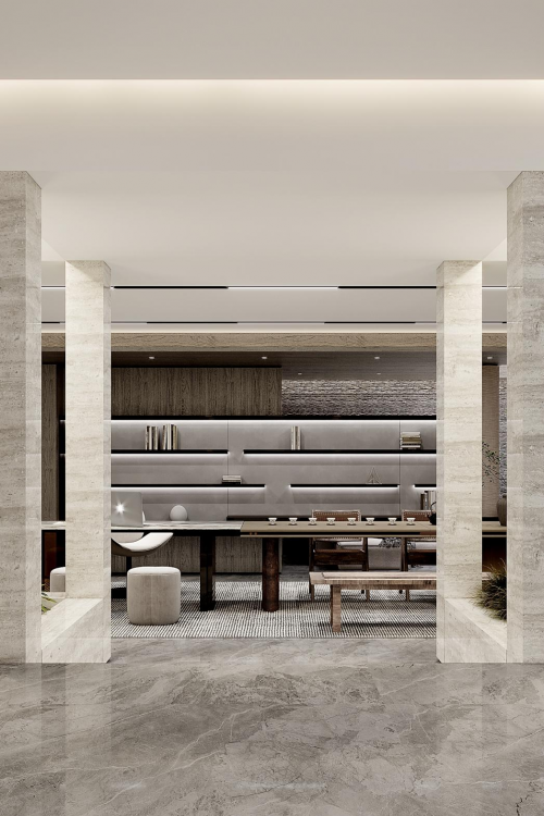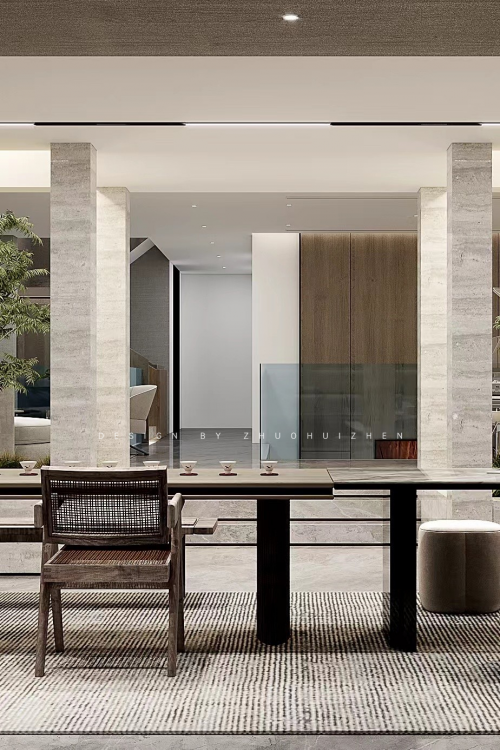 過廊透過盡頭的天井巧妙引入自然光。大理石材質是這一區域的材質基底,與原木材質、自然光交織,帶來清簡、禪意的氛圍。
