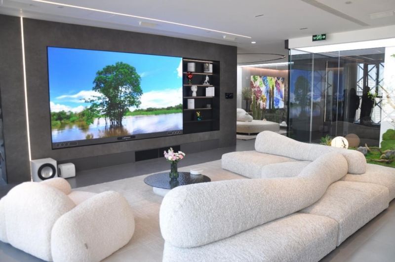 走進店內,獨樹一幟的設計風格,極具空間感的區域規劃搭配黑科技產品——2臺138吋雷曼Micro LED超高清家庭巨幕坐鎮C位,致力打造豪華客廳、私人家庭影院場景,為高端用戶帶來全新沉浸式體驗的同時更帶來了品質生活的解答方法。