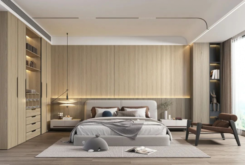 場景轉移來到臥室,臥室風格重點不在于獨特與時尚,而是一個可以把控全局的衣柜,沒有人會拒絕一個收納與顏值并存的衣柜!柜子對于臥室來說起到了一種空間擴充的作用,配合整體風格的打造,將衣物與瑣碎物品進行收納,使房間變得干凈整潔的同時各具有更高的功能性。