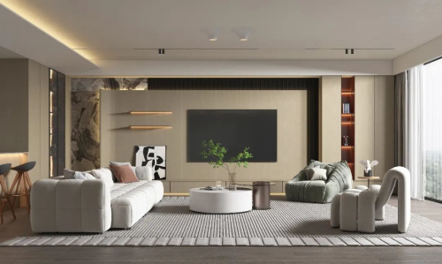 客廳作為家居整體的中心位置,是為家人提供了放松休息的場所,基于此,整體風格搭配就顯得尤其重要,既要滿足家人圍繞溫暖的需求,又要有真正意義上的身心松弛感,所以選擇淺色系與清爽自然的木質紋板材相搭配,才能相得益彰。在兩種風格元素的搭配中,不需要復雜多余的線條就可以讓整體空間低調優雅。