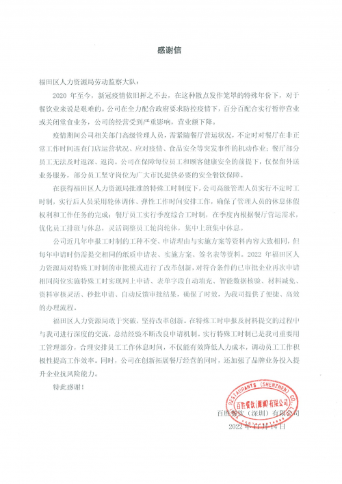 特殊工時改革受惠企業(yè)的感謝信