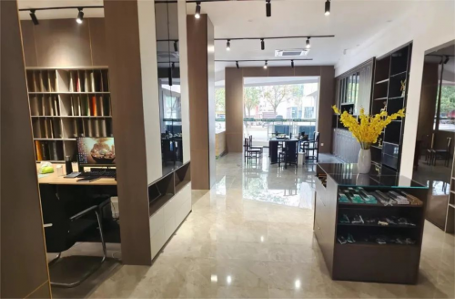 走進門廳,映入眼簾的首先是黑白色簡約風前臺。門店的前臺是千年舟公司品牌文化的體現,極簡風前臺無不彰顯著千年舟的格調與沉穩。