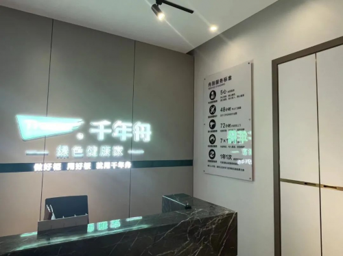 綠色的品牌logo體現著千年舟打造綠色、環保、高品質板材及其配套產品的理念。細看墻上還貼著舟到服務五大標準,為顧客提供良好服務也是千年舟的宗旨之一。
