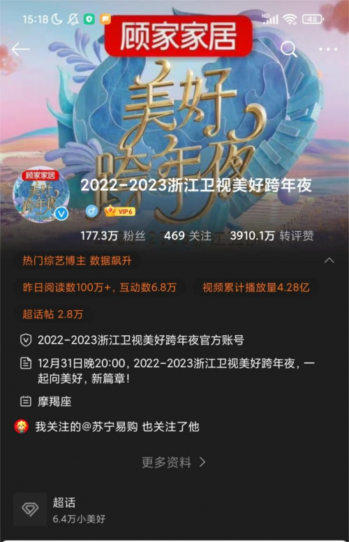 據(jù)不完全統(tǒng)計,此次浙江衛(wèi)視美好跨年夜全網(wǎng)熱搜200+,微博熱搜 118個,微博話題討論量1000萬+,官微視頻播放量2400萬+,微博話題閱讀量 48億+,以亮眼表現(xiàn)完美收官。