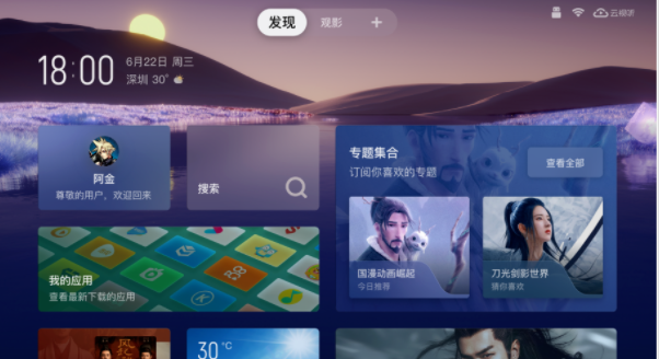 靈控桌面的驚喜不僅僅表現(xiàn)在開機與遙控上,它的桌面設(shè)計更是非常貼心,以往我們在電腦上看到的專屬屏幕,在電視上也可以輕松實現(xiàn),還可以放置一些如天氣類的功能小組件,非常直觀也很個性化。