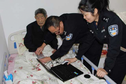 原來,家住旺蒼縣白水鎮的蔣大爺,因在家摔傷頭部,到廣元市第二人民醫院接受治療。大爺的身份證在轉院過程中丟失,報銷治療費用必須要用身份證,而辦身份證又需采集指紋,蔣大爺的兒子情急之下向公安窗口民警求助。了解情況后,民警趕到醫院,專門為老人采集指紋和相片。由于上年紀的人指紋不清晰,民警一遍遍用濕巾輕輕擦拭老人手指,也一遍遍地安慰著老人。