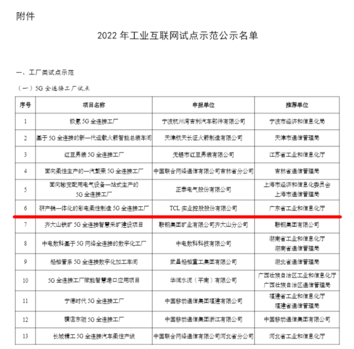 除了海量顯示技術專利外,近些年TCL深度融合5G、AI、IoT、大數據、云計算等新興技術,全面推行以“智慧顯示”為核心、打造“智能物聯生態”戰略。這不,在工業和信息化部公示的2022年工業互聯網試點示范名單中,TCL就作為全國智能家電行業的獨苗入選了。