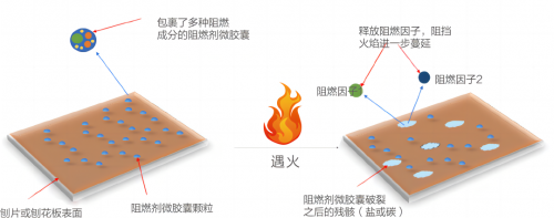 板材受熱時(shí),刨片表面的微膠囊破裂,吸收熱量,同時(shí)釋放的高效阻燃因子能稀釋燃燒區(qū)域的可燃物濃度,有效抑制火焰蔓延。微膠囊破裂后,碳化、鹽化的產(chǎn)物覆蓋在刨片表面,阻止煙氣逸出,實(shí)現(xiàn)阻燃抑煙的雙重效果。