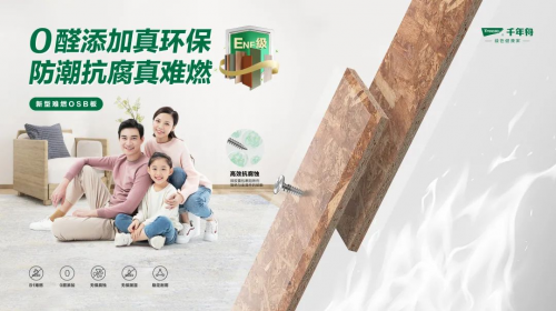 其中新型難燃OSB板作為千年舟最新一代難燃OSB板,更是在原有難燃OSB板上進(jìn)行升級(jí),提高板材實(shí)用性,讓家更安心,安全性更高。新型難燃OSB板經(jīng)過(guò)阻燃處理,達(dá)到B1級(jí)難燃,同時(shí)采用微膠囊包覆技術(shù),升級(jí)抗腐性功能,是一款具有高難燃、抗腐蝕、防潮、性能穩(wěn)定的環(huán)保板材。