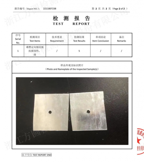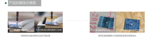結(jié)合微膠囊包覆技術(shù),對(duì)阻燃劑有效主體形成包覆作用,隔絕阻燃劑與金屬件的接觸,有效降低阻燃劑對(duì)金屬件的腐蝕作用,全面提高板材的抗腐蝕性,達(dá)到企業(yè)標(biāo)準(zhǔn)抗腐蝕性5級(jí)(輕鋼龍骨和自攻螺絲均無(wú)明顯變化)。