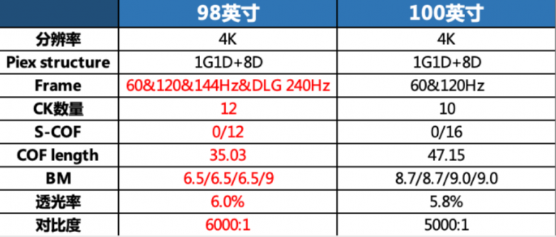 在同等的4k分辨率下,98英寸的CK時(shí)鐘數(shù)要高過(guò)100英寸的,上面原理部分也解釋了,更高的CK時(shí)鐘數(shù)會(huì)讓充電速度更快,進(jìn)而最終的色彩準(zhǔn)確度、均勻性都有更好的控制;透光率即是上面提到的開(kāi)口率,更高的透光率也會(huì)讓98英寸屏幕比100英寸屏幕帶來(lái)更多性能上的優(yōu)勢(shì)。
