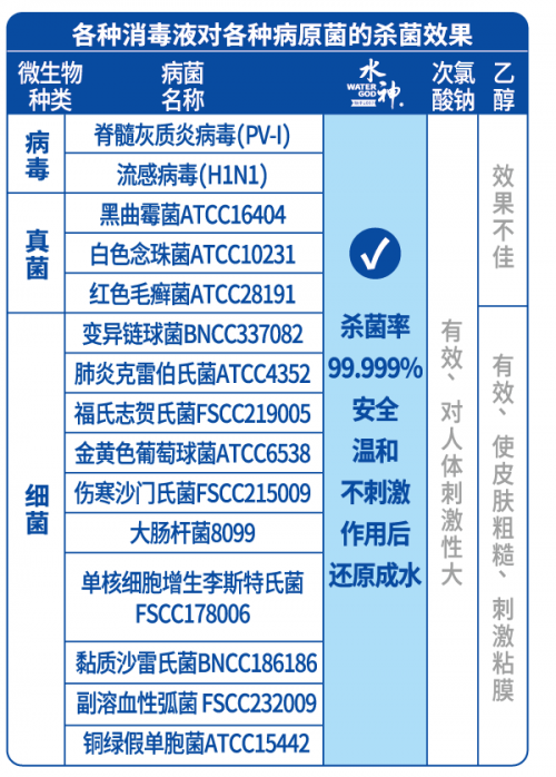 還是以旺旺家的水神HD-4L消毒機為例,150s能制取4L水神次氯酸消毒液,殺菌率99.999%,可以殺滅常見的大腸桿菌、金黃色葡萄球菌等病毒,也能殺滅人群中流行的H1N1(甲流)病毒、脊髓灰質炎病毒(它是造成小兒麻痹癥的元兇)等,消毒效果有保障。