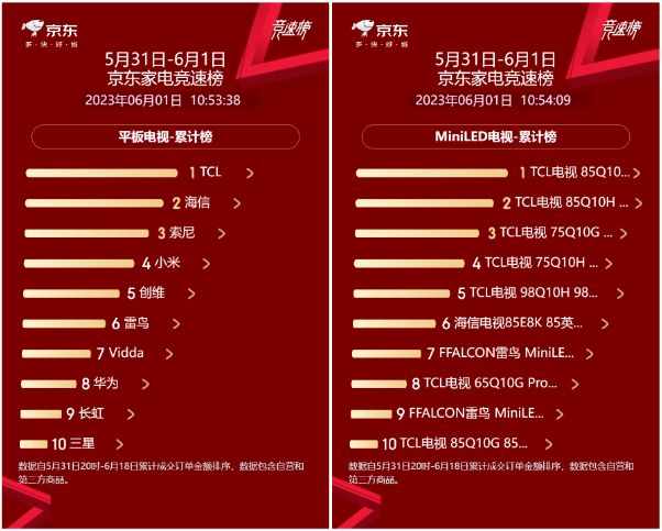 綜上所述,618選購電視時了解普通電視和高畫質電視的區別非常重要。TCL T7G作為一款真正具備高畫質的電視,可以提供更為極致的畫面對比度與亮度,以及更為真實自然的色彩,65寸海信E5K在配置全面落下風的同時,價格方面還要比TCL T7G貴100元,顯然TCL T7G是更為靠譜的選擇;與此同時,618電視銷量榜新鮮出爐,TCL電視霸居榜首,這其中T7G、以及新發布的Q10H都是功不可沒的,群眾的眼睛是雪亮的,跟著大家買一定不會買錯!