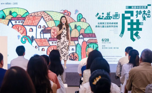 隨后深圳星河第三空間項目總經理助理趙艷芬女士上臺發言,她表示本次活動是繼2021年“心有微光、助夢遠航”拍賣會后與創域設計的又一次攜手,共同為鄉村公益美學教育獻上自己的愛心,這也是踐行星河第三空間企業的社會責任。“眼中有光,心中有愛”,匯集大家的點滴愛心,去助力鄉村孩子們的夢想。