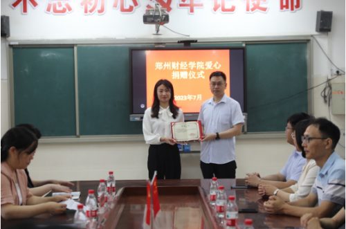 隨后,鄭州財經學院團委書記周二濤、校工會副主席袁清分別向高村鄉一小、二小校長捐贈物資。高村鄉副鄉長楊靜向鄭州財經學院外國語學院黨總支書記閆靜授予捐贈贈書。