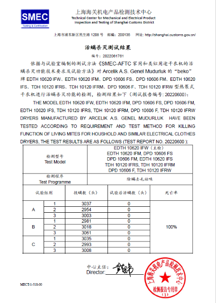 *上海海關機電產品檢測技術中心報告,報告編號2022061761,除螨去毛祛味程序下,除螨率高達100%