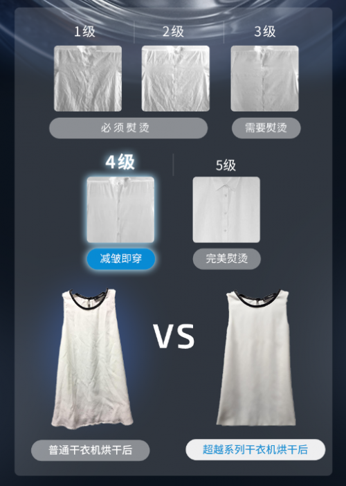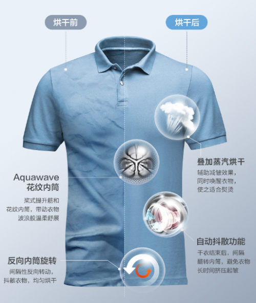 作為熨平褶皺的干衣魔法師,通過模擬熨燙過程,將理想溫度的水和蒸汽噴灑在衣物上,衣物烘干后達到AATCC 124標準下的4級平整度*,即“減皺即穿”的程度。襯衫、T恤等烘干后無需熨燙,即可達到較好的除皺穿著效果。