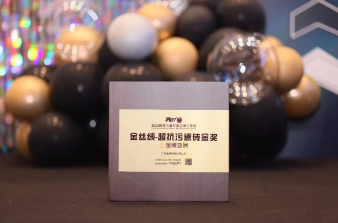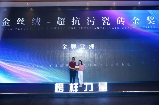 在這場榜樣盛典上,金牌亞洲憑借超硬核實力的金絲絨超抗污柔光磚,在眾多優秀品牌和產品中突圍而出,斬獲年度超抗污瓷磚金獎。
