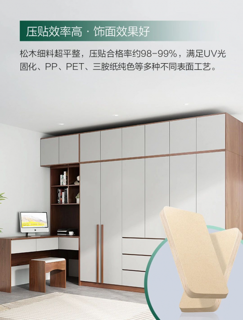飾能板飾面系列采用全桉木多層板為芯材,上下表層鋪裝進口松木細料刨花,經熱壓一體化成型,表面平整度高,堅實耐用的板材更能陪伴漫長歲月。
