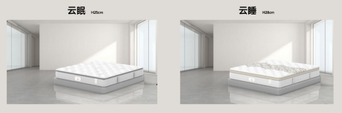 在選材上,“云眠”床墊和“云睡”床墊采用高檔針織面料、天然乳膠、3cm蛋形海綿和靜音袋裝彈簧,使得床墊更加透氣抗菌,耐磨耐用,在使用過程中通過谷峰落差散熱,深度釋壓貼合曲線,適應多種睡姿變化;“云寐”床墊通過軟包裹+硬支撐打造極致睡感,軟包裹包括5cm的飽滿舒適親膚層和3cm記憶棉+2cm天然乳膠組成的填充層,硬支撐則依托雙重彈簧支撐系統精準感應身體壓力,與身體結構高度契合,可以按照人體工程學為消費者舒緩壓力;“奢里”床墊則擁有5cm體感層+循環空氣層的獨特設計,材料選用美利奴羊毛棉、高分子3D材料、3cm天然乳膠、18cm柔性靜音彈簧等,打造星級睡感和極致體驗。